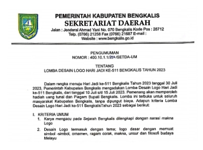 RIAUMADANI. COM, BENGKALIS - Dalam rangka Hari Jadi ke-511 Bengkalis tepat pada tanggal 31 Juli 2023, Pemerintah Kabupaten Bengkalis menaja lomba desain logo Hari Jadi ke-511.