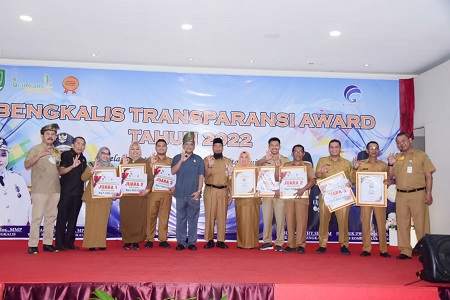 RIAUMADANI. COM. BATHIN SOLAPAN - Bupati Bengkalis Kasmarni diwakili Asisten Pemerintahan dan Kesejahteraan Rakyat Andris Wasono menyerahkan penghargaan "Bengkalis Transparansi Award" (BTA) 2022.