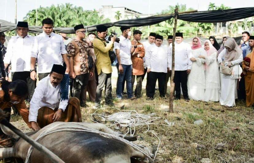 MANDAU - Usai melaksanakan salat Idul Adha di Masjid Arafah, Minggu (10/7/2022), Bupati Bengkalis Kasmarni menyaksikan penyembelihan hewan.