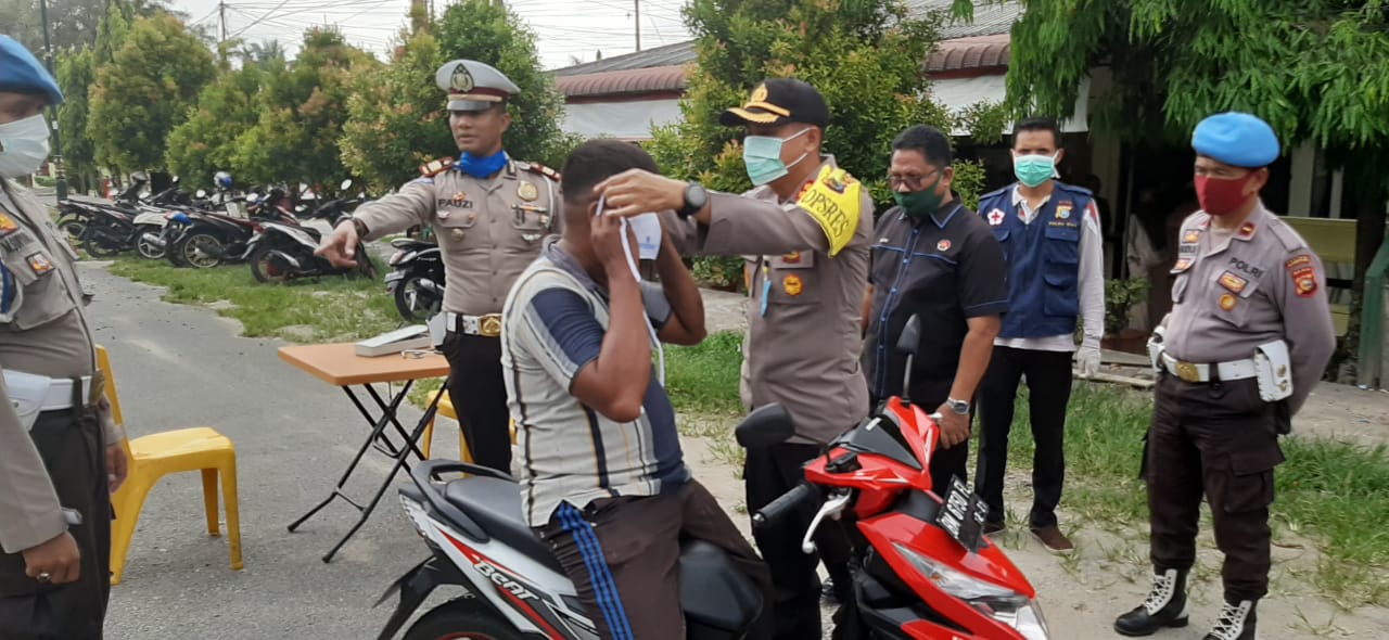 BANGKINANG. RIAUMADANI. COM - Kapolres Kampar AKBP Mohammad Kholid SIK, didampingi Waka Polres Kompol Ricky Ricardo SIK dan Kasat Lantas AKP Fauzi SH, MH melaksanakan pembagian masker kepada pengguna jalan M. Yamin Kota.