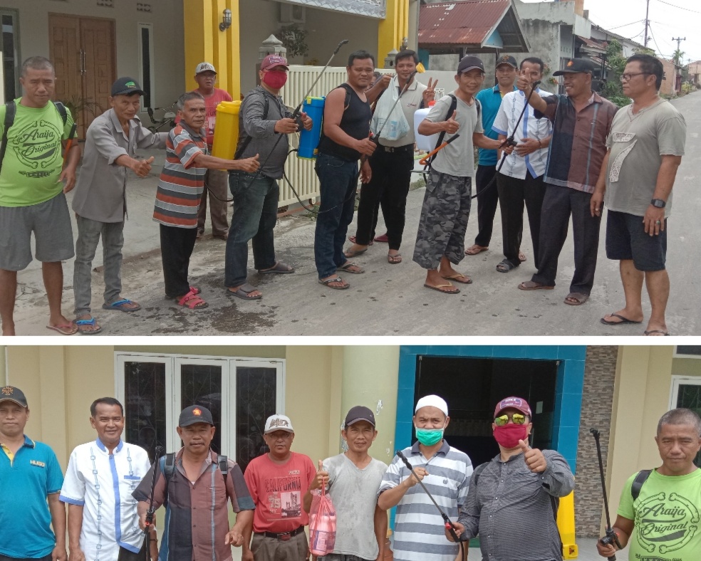 KUBANG JAYA. RIAUMADANI. COM - Kepala desa Kubang Jaya bersama masyarakat Perumahan Kubang Pratama Permai II (KPP.II) melaksanakan kegiatan Disinfeksi Penyemprotan lingkungan perumahan warga dan Masjid Nurul Huda Rabu.