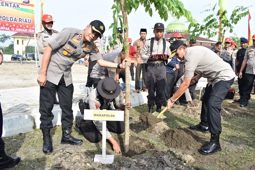 KAMPAR. RIAUMADANI. COM - Waka Polda Riau Brigjen Pol Drs. Sutrisno Yudi Hermawan, melakukan Penanaman Pohon secara serentak bertempat di kawasan pembangunan SPN Polda Riau Desa Kualu.