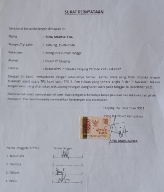 KAMPAR - Pasca dikalahkannya calon Kepala Desa Tanjung Koto Kampar Hulu, Nasrullah setelah proses penghitungan ulang surat suara pada 16 Desember 2021 lalu, yang salah satu sebabnya ditemukan suara suara pada TPS 7 yang tak.