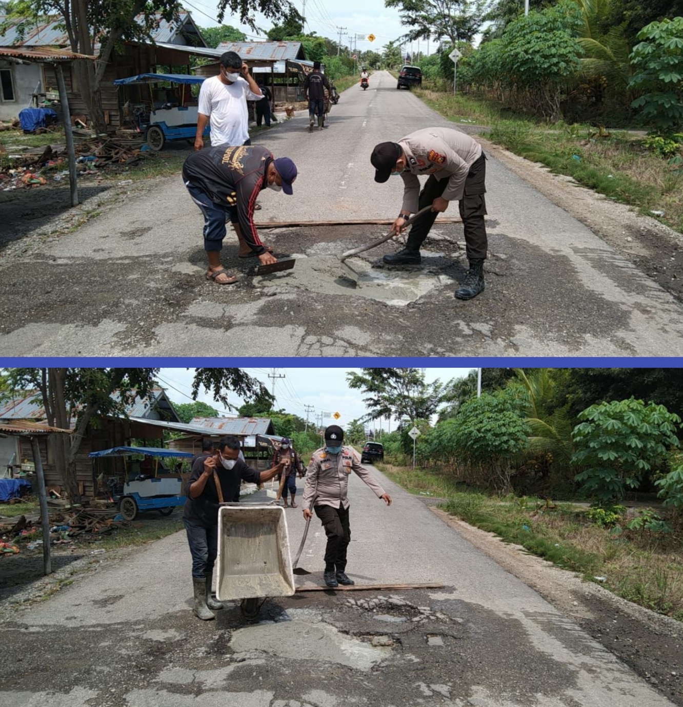 RIAUMADANI. COM - Bhabinkamtibmas Desa Gogok Darusaalam bersama Ormas RComunity Kepulauan Meranti dan warga Desa Gogok melakukan Gotong Royong (Goro) memperbaiki jalan yang berlubang di wilayah jalan Lintas Desa Gogok.