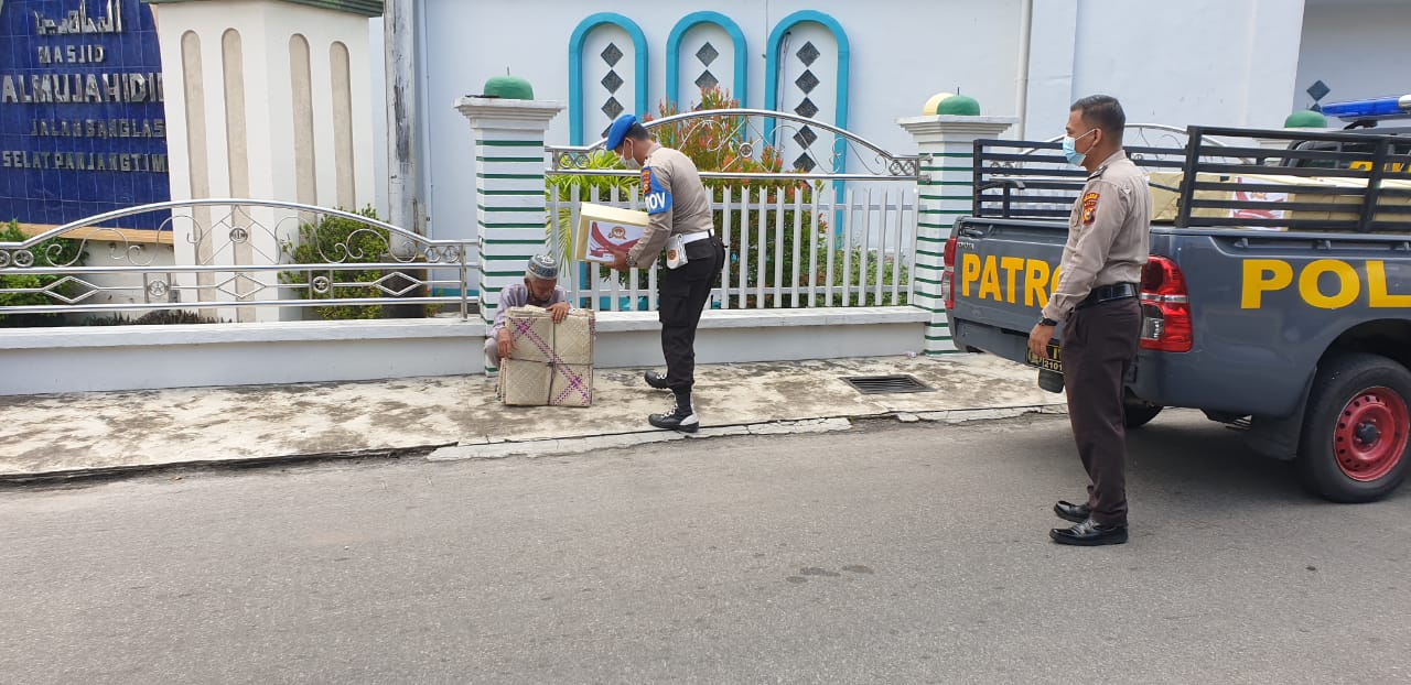 RIAUMADANI. COM – Kapolsek Tebingtinggi IPTU Aguslan, S.H. bersama anggotanya menyerahkan parsel kepada pihak Pesantren dan salah seorang warga Penjual Tikar di.