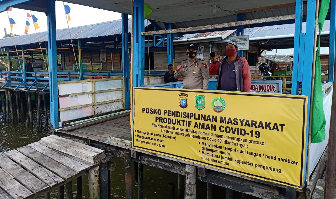 SELATPANJANG. RIAUMADANI. COM - Seperti biasa, Minggu 30 Agustus 2020, personil Polsek Rangsang Barat tetap siaga di Posko Pendisiplinan Masyarakat Produktif Aman Covid-19 di Pelabuhan Kempang Sialang Pasung, Kecamatan Rangsang.