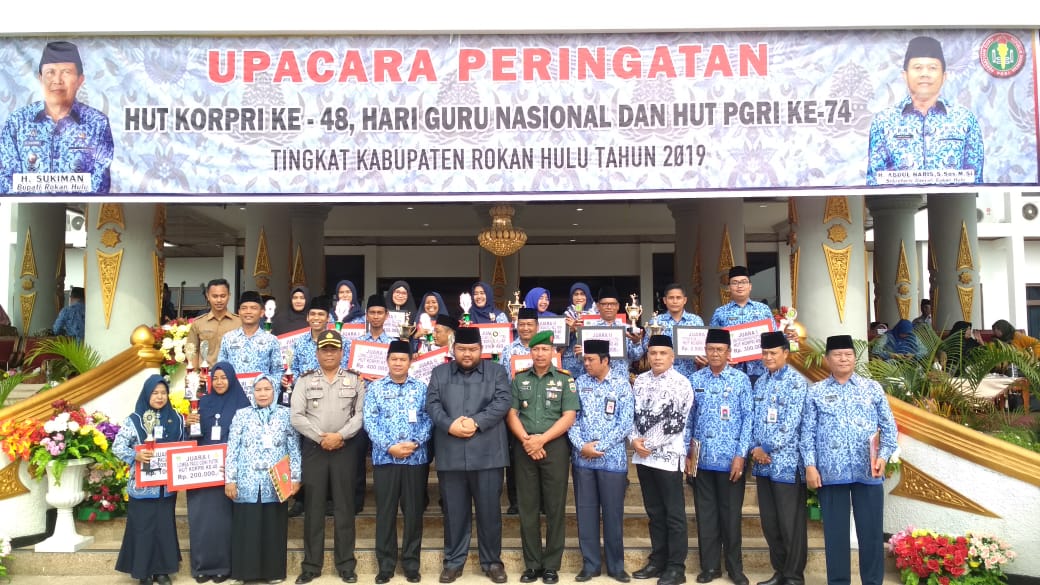 PASIR PENGARAIAN. RIAUMADANI. COM - Dalam rangka pelaksanaan Hari Guru Nasional dan Hut PGRI yang ke 74 serta Hut Korpri yang ke 48 tingkat Kab.Rokanhulu yang dilaksanakan dihalaman Kantor Bupati Rokanhulu, Senin, (02/12 /2019), berjalan Hikmat dan.