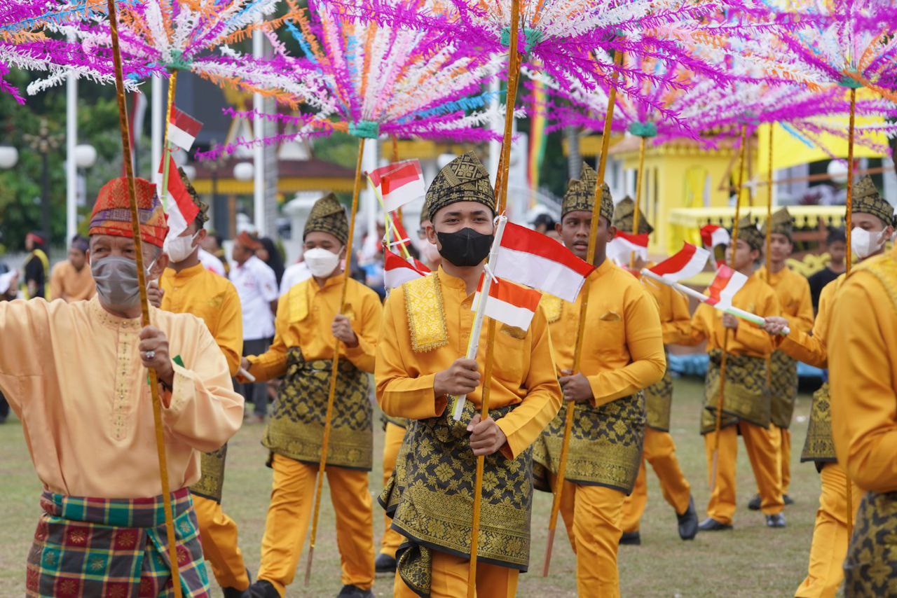PEKANBARU - Ribuan masyarakat Riau di Bumi Lancang Kuning mengikuti Pawai Budaya dalam rangka memeriahkan Hari Jadi ke-65 Provinsi Riau dan HUT Kemerdekaan RI ke-77.