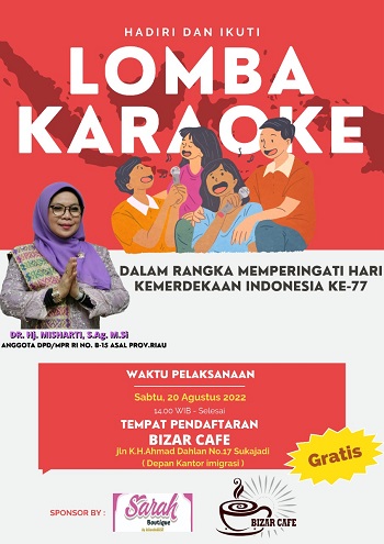 PEKANBARU - Dalam rangka memeriahkan hari kemerdekaan Republik Indonesia yang ke-77, Bizar Cafe bersama Sarah Boutiqe akan menggelar Lomba Karaoke untuk warga Kota Pekanbaru.