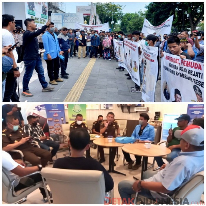 PEKANBARU - Ratusan massa Gerakan Pemuda Mahasiswa Pekanbaru Peduli Keadilan berdemonstrasi di Kejaksaan Tinggi Riau Rabu.