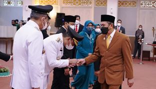 PEKANBARU - Gubri Syamsuar melantik sekaligus memimpin langsung pengambilan sumpah jabatan Muflihun sebagai Pj Walikota Pekanbaru dan Kamsol sebagai Pj Bupati Kampar. Pelantikan yang dijadwalkan pukul 09.00 WIB itu molor kurang lebih 30 menit tanpa.