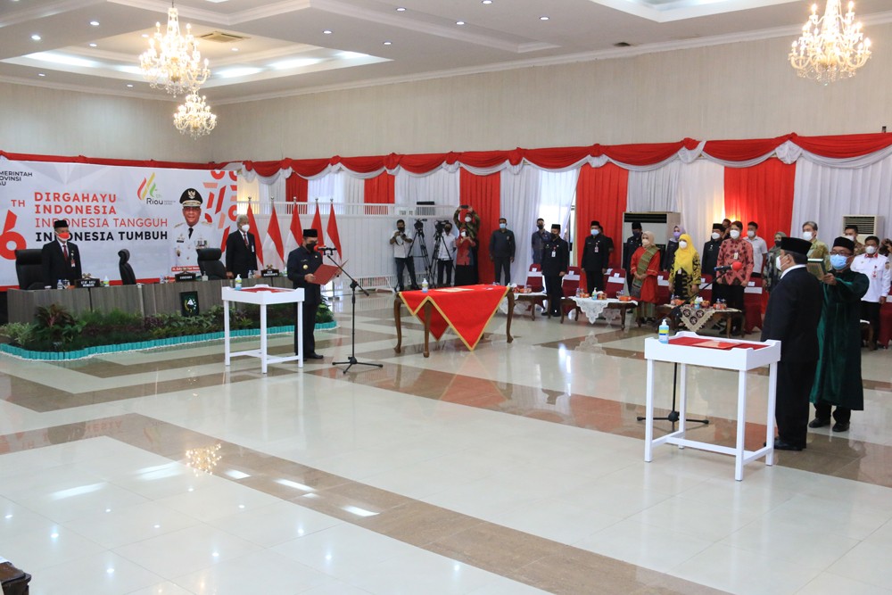 RIAUMADANI. COM - Gubernur Riau (Gubri) Syamsuar resmi melantik Sekretaris daerah provinsi (Sekdaprov) Riau terpilih, SF Hariyanto, Rabu (18/8/21). Pelantikan dilaksanakan di Balai Serindit gedung daerah Riau, Jalan Diponegoro,.