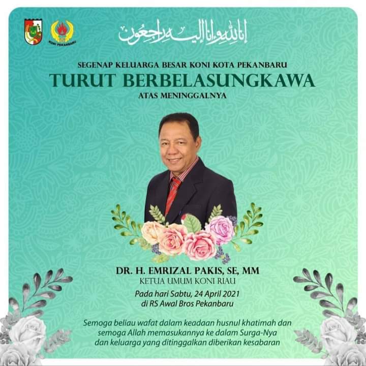RIAUMADANI. COM - Provinsi Riau kembali kehilangan salah seorang tokoh terbaiknya. Pagi ini, Sabtu (24/4/2021), mantan birokrat yang juga Ketua Umum KONI Riau, Emrizal Pakis, wafat setelah sebelumnya terpapar virus Corona.