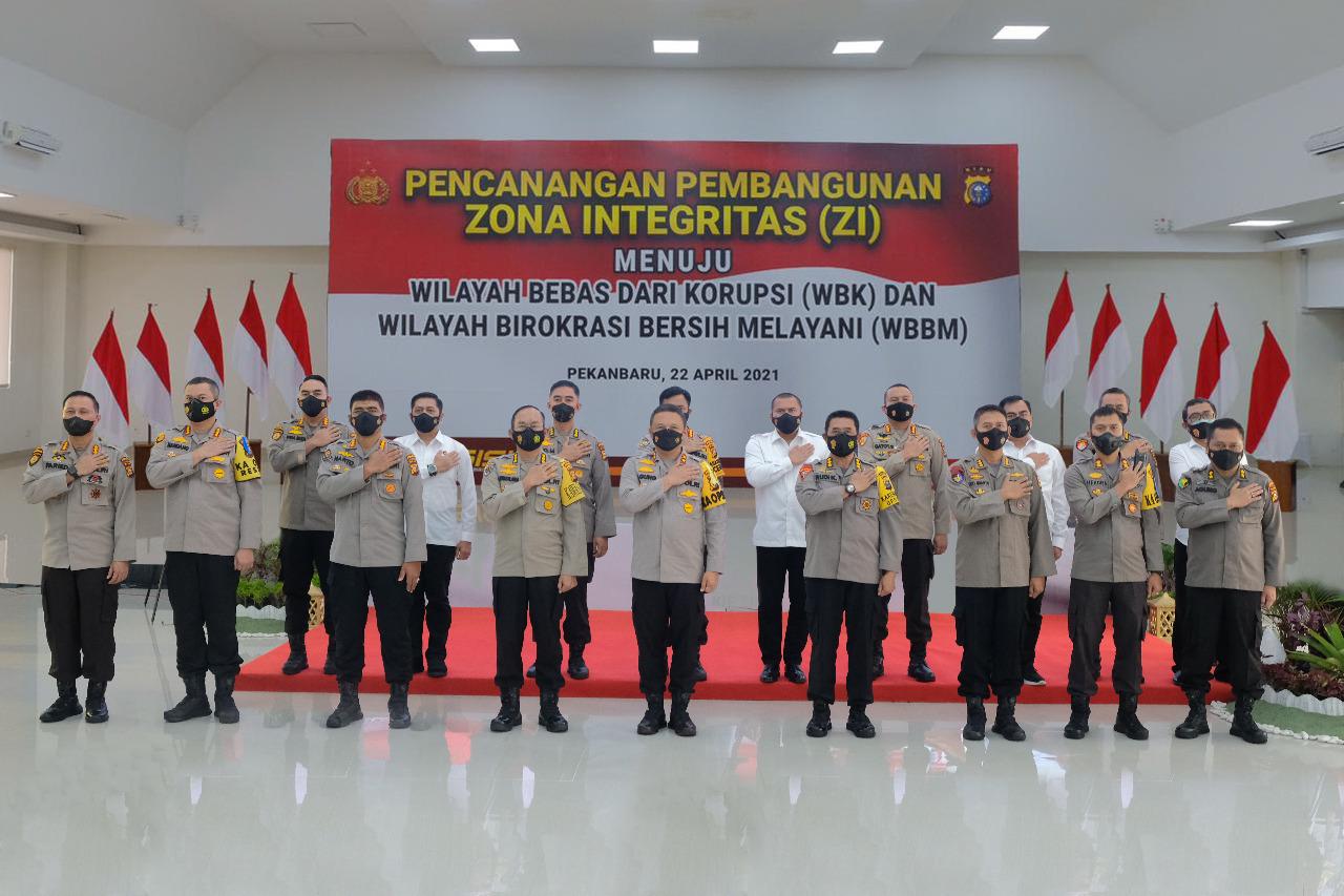RIAUMADANI. COM - Kapolda Riau, Irjen Pol Agung Setya Imam Efendi mendeklarasikan Pencanangan Pembangunan Zona Integrasi (ZI) menuju Wilayah Bebas Dari Korupsi (WBK) bagi 15 Satker dan Wilayah Birokrasi Bersih Melayani.