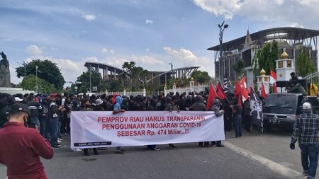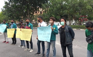 PEKANBARU. RIAUMADANI. COM - Aliansi Mahasiswa dan Pemuda se-Provinsi Riau Pemantau Bebas Korupsi menggelar aksi demonstrasi di depan Kantor Gubernur Riau, pada, Jumat (18/9/2020).