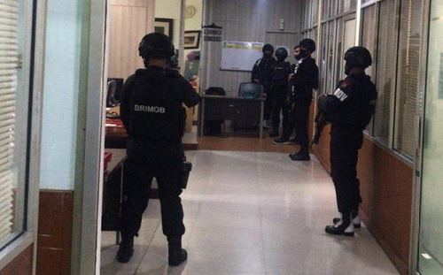PEKANBARU. RIAUMADANI. COM - Sejumlah personil Brimob Polda Riau berpakaian antiteor lengkap dengan senapan serbu berada di Kantor Dinas Pendidikan Provinsi Riau. Mereka mengawal Tim Khusus atau Timsus Kejaksaan.