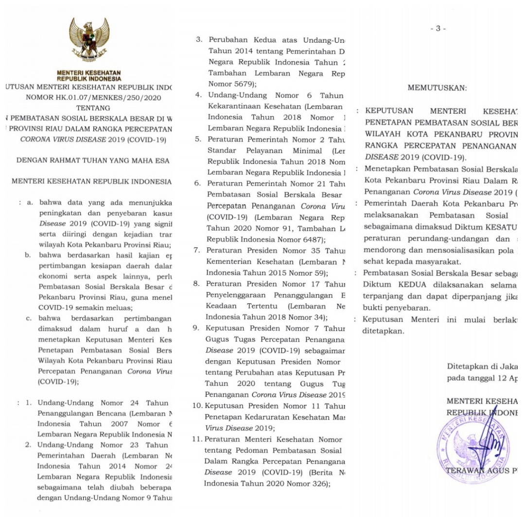 PEKANBARU. RIAUMADANI. COM - Melalui Surat Keputusan (SK) Nomor HK.01.07/Menkes/250/2020 tentang Penetapan PSBB di Wilayah Kota.
