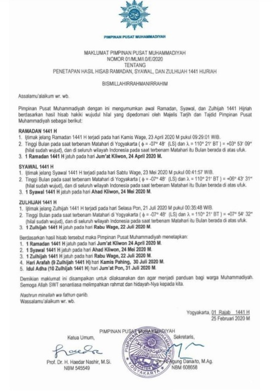 JAKARTA. RIAUMADANI. COM - Muhammadiyah merilis hasil hisab Ramadhan, Syawal, Zulhijah 1441 Hijriah atau tahun 2020 Masehi. Awal Ramadhan ditetapkan pada 24 April 2020, sementara Lebaran pada 24 Mei.