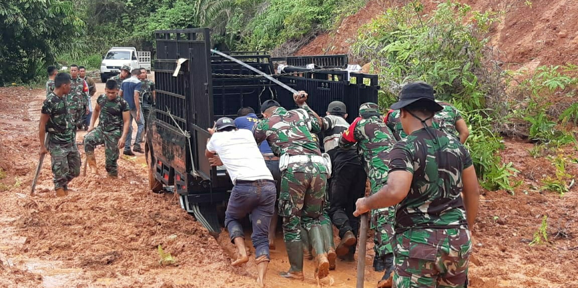 ACEH. RIAUMADANI. COM - Personil Koramil 13/Kluet Timur, Anggota Bataliyon RK 115/ML dan Polsek Kluet Timur serta warga bekerja bakti membersihkan tanah longsor yang menutupi badan.