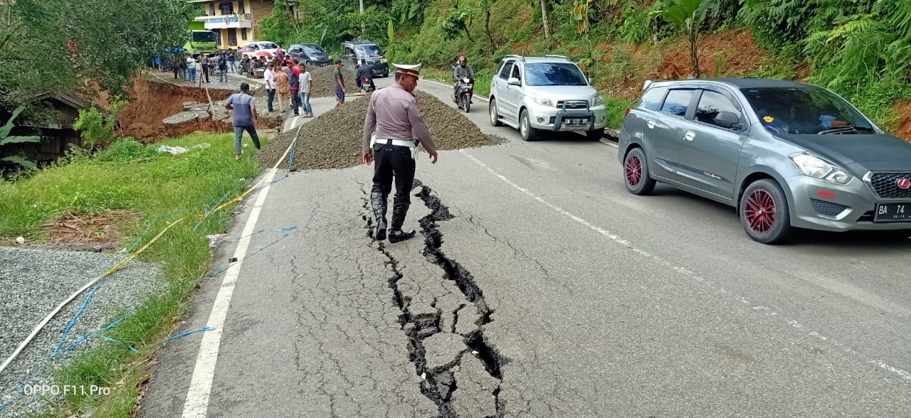 PANGKALAN. RIAUMADANI. COM - Jalan lintas jalur utama Sumbar- Riau tepatnya di km 161 Jorong Simpangtiga Nagari Koto Alam Kecamatan Pangkalan Kotobaru Kabupaten Limapuluh kota Sumbar mengalami retak/amblas sepanjang 30.