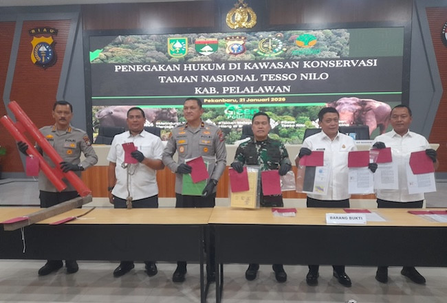 PEKANBARU. RIAU MADANI. COM - Polda Riau melalui Satgas Tim Percepatan Pemulihan (TP2) Taman Nasional Tesso Nilo (TNTN) menetapkan 6 orang sebagai tersangka atas dugaan perusakan fasilitas Poskotis Taman Nasional Tesso.