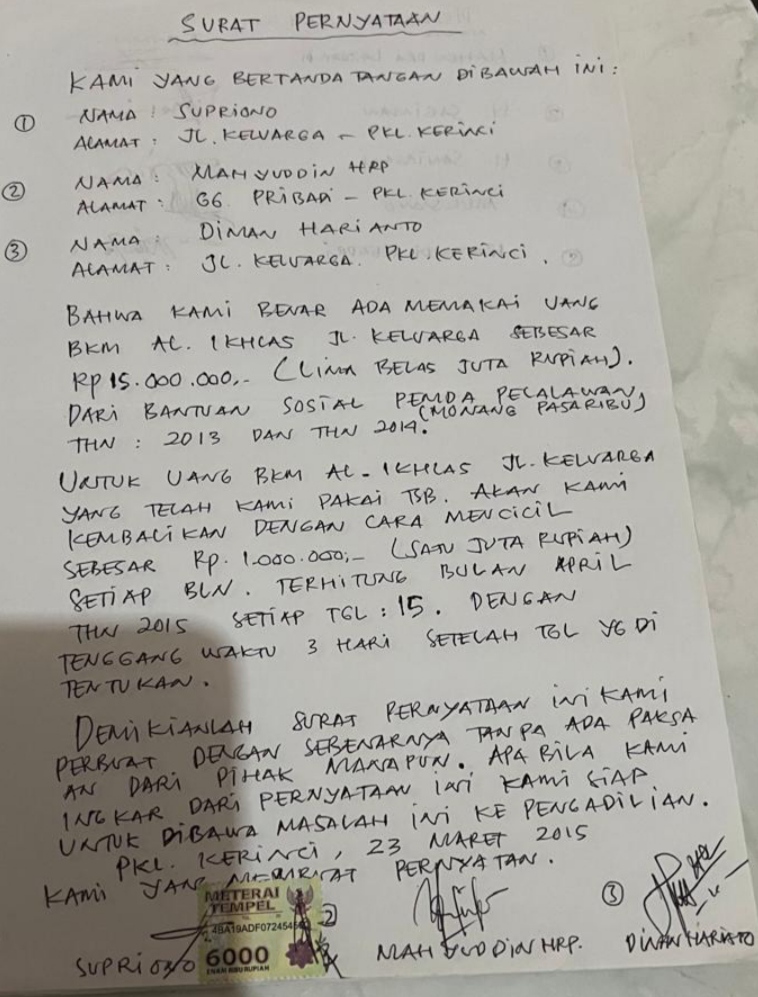 PELALAWAN. RIAU MADANI. COM - Surat-surat hibah yang diterbitkan atas nama Datuk Batin Hitam Sungai Medang Almarhum Abdul Arifin diduga kuat rekayasa. Modus operandi perusakan lahan TNTN tersebut akibat surat hibah yang diduga.
