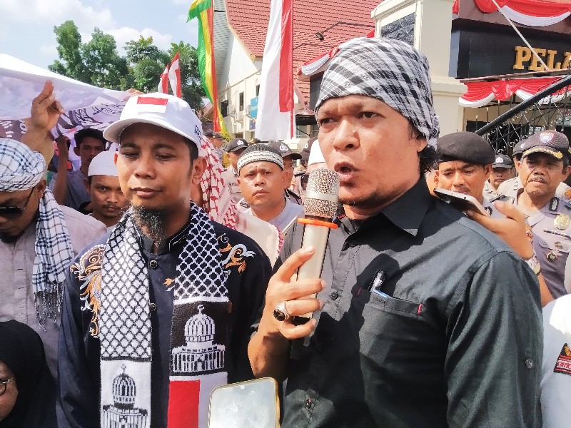 aspirasinya membela Ustaz Abdul Somad (UAS) di depan pintu masuk Mapolda