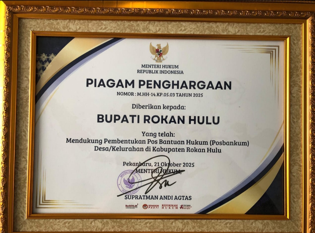 PEKANBARU. RIAU MADANI. COM – Komitmen kuat Pemerintah Kabupaten Rokan Hulu (Rohul) dalam memperluas akses keadilan bagi masyarakat kembali membuahkan penghargaan bergengsi. Bupati Rokan.