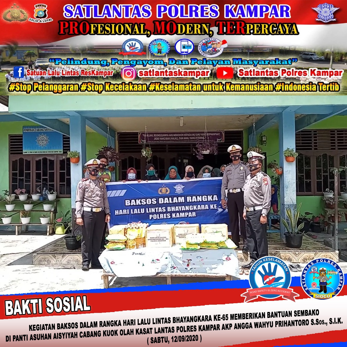 Dalam rangka memperingati Hari Lalulintas Bhayangkara ke-65 tahun 2020, Satuan lalulintas Polres Kampar menggelar kegiatan Bakti Sosial, ke Panti Asuhan Putri Aisyiyah di Kecamatan Kuok pada Sabtu pagi (