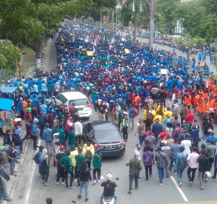 DPRD Provinsi Riau digeruduk Ribuan massa dari Aliansi Mahasiswa Universtas Islam Riau dan masyarakat Tolak UU Cipta Kerja Omni buslaw