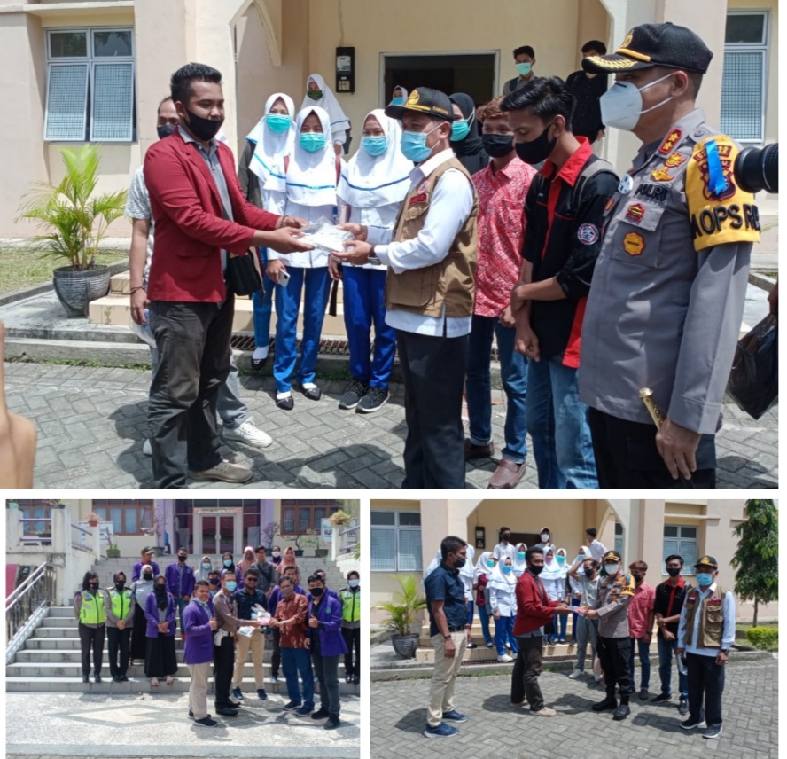 Selanjutnya Kapolres Kampar membagikan masker secara simbolis kepada perwakilan Mahasiswa Universitas Pahlawan Tuanku Tambusai Bangkinang, untuk selanjutnya didistribusikan kepada rekan-rekan mahasiswa lainnya.