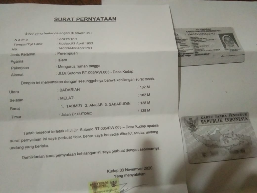 SELATPANJANG. RIAUMADANI. COM - Salah seorang warga Desa Kudap, bernama Zahara telah kehilangan Surat Tanah yang beralamat di jalan Dr. Sutomo RT.005/RW 003 Desa Kudap, Kecamatan Tasik Putri Puyu, Kabupaten Kepulauan Meranti, Provinsi Riau.