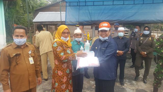 Bupati Kepulauan Meranti, Drs H Irwan menyerahkan bantuan APD dan hand sanitizer ke petugas di Desa Tanjung Peranap.
