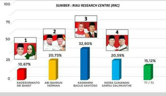 DURI. RIAUMADANI. COM - Salah satu lembaga survei   merilis hasil survei terbaru Pilkada Kabupaten Bengkalis 2020. Dalam survei itu pasangan nomor urut 3 Kasmarni-Bagus menempati urutan pertama dengan elektabilitas tertinggi sebesar 32,90 persen. Pasangan KBS berpeluang besar menang dalam pilkada Bengkalis karena selisih tingkat elektabilitas dengan paslon no 2 Aman sebesar 12,17 persen.