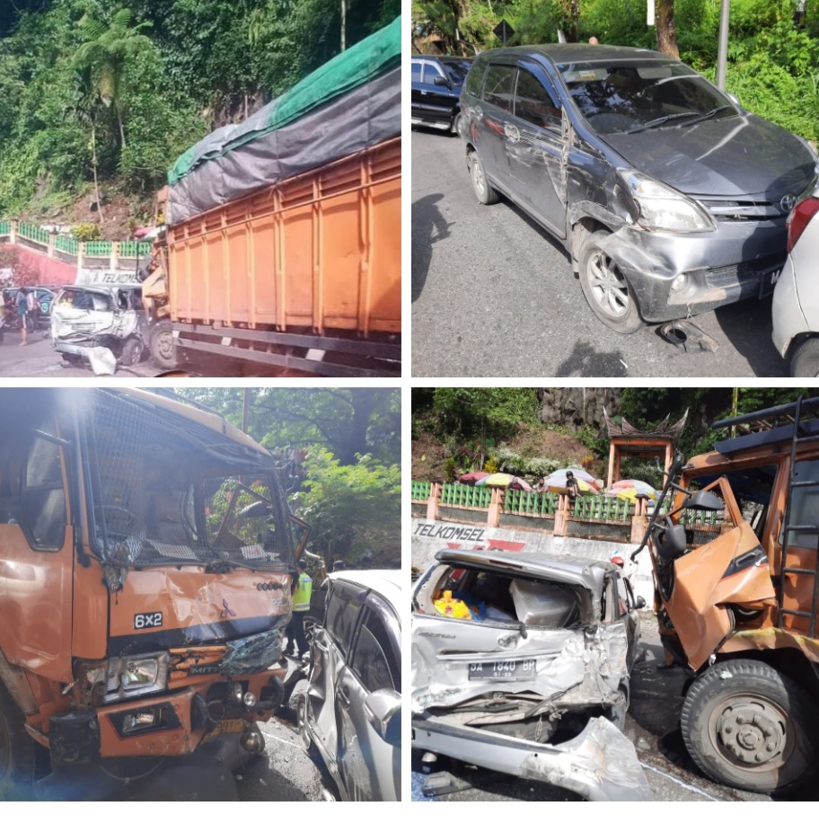 Diduga kehilangan kendali akibat rem blong, satu unit truk tronton menyeruduk belasan kendaraan. Kecelakaan beruntun ini terjadi di kawasan Air Terjun Lembah Anai, Rabu (30/12/2020)