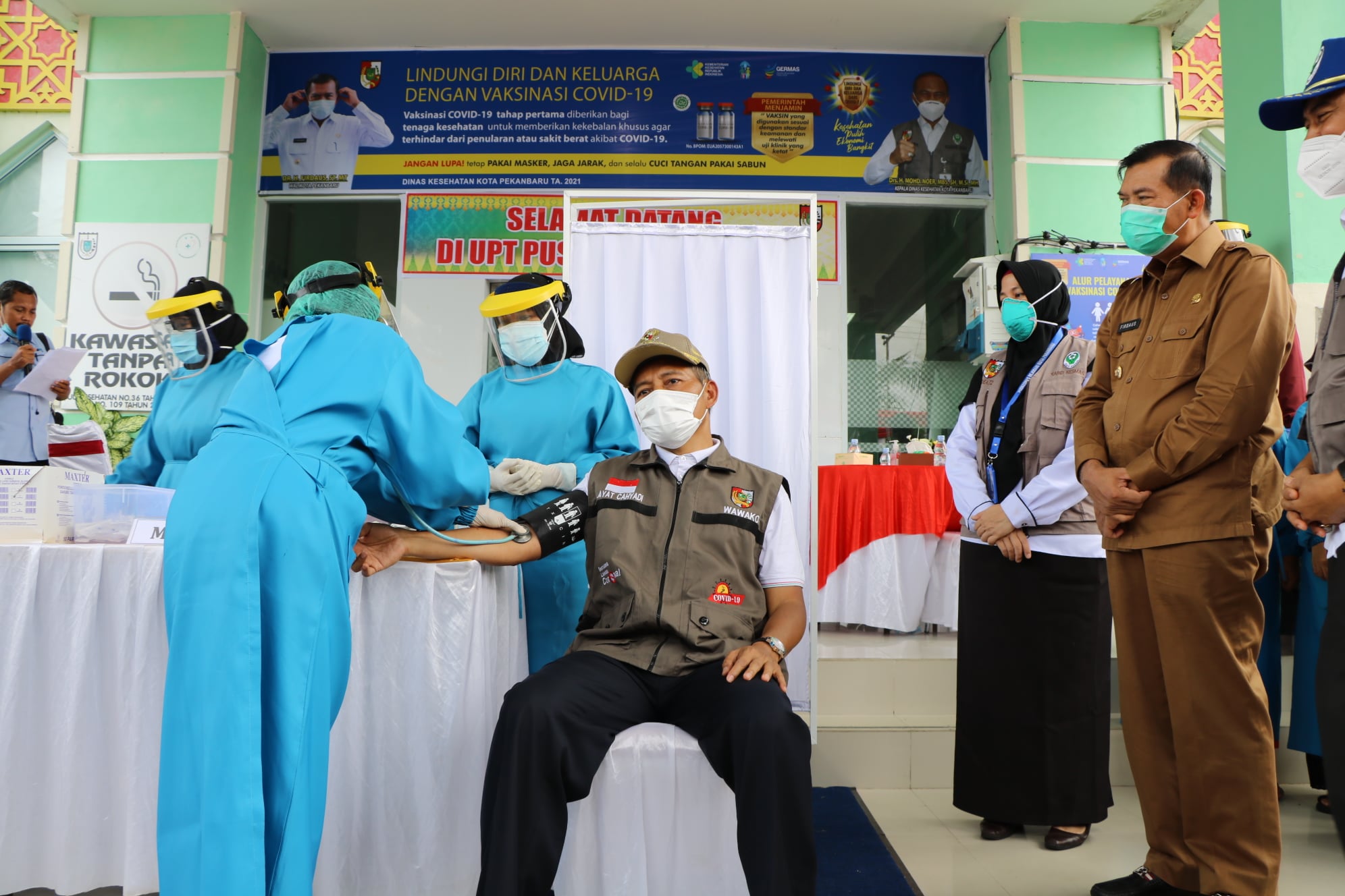 RIAUMADANI. COM - Wakil Wali Kota (Wawako) Pekanbaru Ayat Cahyadi serta sembilan pejabat publik, tokoh agama, dan tokoh masyarakat sudah disuntik vaksin Covid-19 jenis Sinovac di Puskesmas Rejosari, Kamis (14/01/2021).