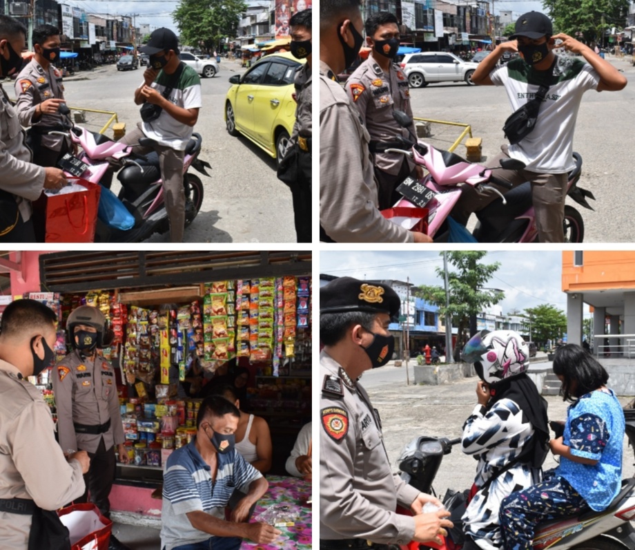 Personel Polres Kampar ini kemudian mendatangi lokasi-lokasi pusat keramaian yang ada di Kota Bangkinang, seperti kawasan pasar Ramayana dan tempat keramaian lainnya untuk membagikan masker yang telah dipersiapkan.