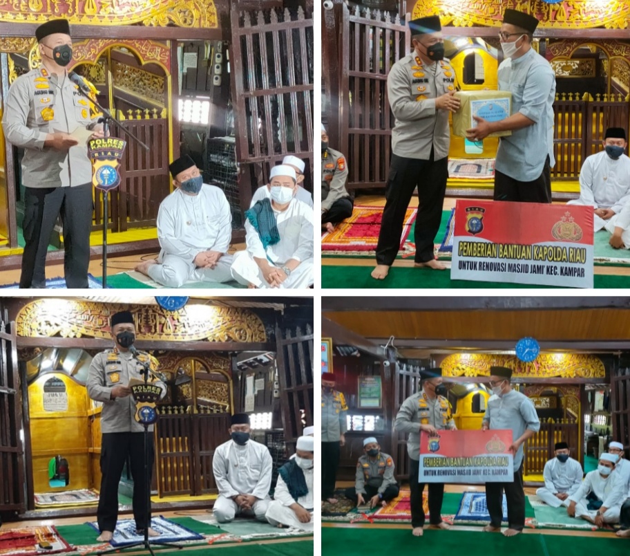 Usai menyampaikan sambutannya, Kapolda Riau menyerahkan Bantuan untuk Renovasi Masjid Jami Air Tiris, yang diserahkan secara simbolis kepada Pengurus Masjid Jami Air Tiris, bantuan berupa Kubah Menara Masjid dan 100 Al Qur an.