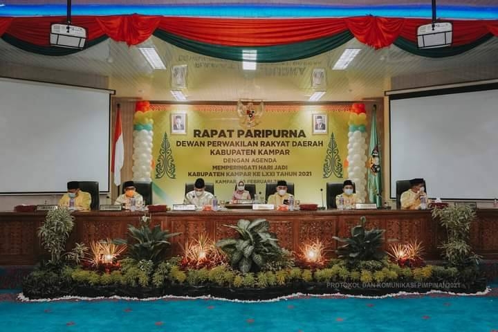 Pelaksanaan Sidang Paripurna Istimewa HUT ke-71 Kabupaten Kampar tahun 2021 ini tampak berbeda dari tahun-tahun sebelumnya. Karena disaat wabah Pandemi Covid-19 melanda Negeri ini dan dilaksanakan secara virtual dengan menerapkan protokol Kesehatan tamu undanganpun dibatasi