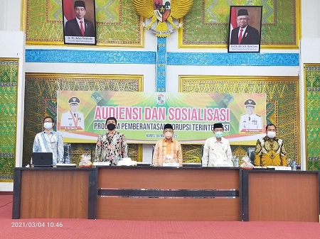 Acara audensi dan sosialisasi program pemberantasan korupsi terintegrasi oleh KPK dilaksanakan di gedung daerah Datuk Laksemana Mangkudiraja, samping kantor Bupati Pelalawan pada hari Kamis (4/3/2021).