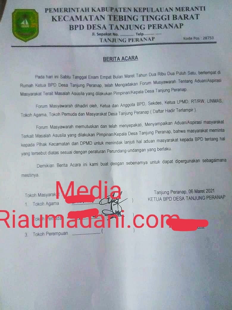RIAUMADANI. COM - Perbuatan yang tidak senonoh yang dilakukan oleh oknum Kades Desa Tanjung Peranap, Kecamatan Tebing Tinggi Barat, Kabupaten Kepulauan Meranti, dengan aksi dilakukannya diduga Kades tega menyetubuhi adik iparnya sendiri hingga korban hamil.