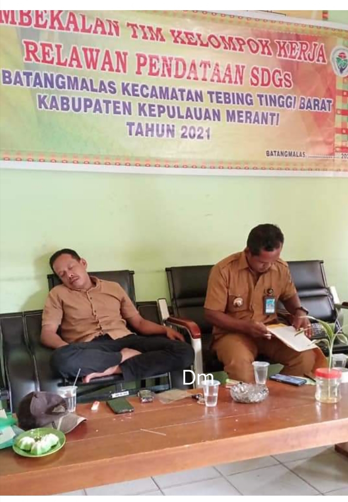 RIAUMADANI. COM - Kepala Desa (Kades) Batang Malas Kecamatan Tebingtinggi Barat Kabupaten Kepulauan Meranti, Abdul Aziz diduga tidak konkret dalam menjalankan tugas selaku pelayanan masyarakat. pasalnya, dalam melaksanakan Rapat Perbekalan Tim Kelompok Kerja Relawan Pendataan, Sustainable Development Goals (SDGs) kemasyarakat setempat, dirinya sempat mempostingkan Perangkat Desanya saat ketiduran.