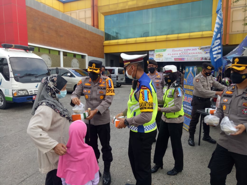 Sebanyak 200 paket takjil untuk menu buka puasa dan 200 masker yang disiapkan dari Polres Kampar, dibagikan kepada pengunjung pasar dan pengguna jalan yang melintas di seputaran Plaza Bangkinang.