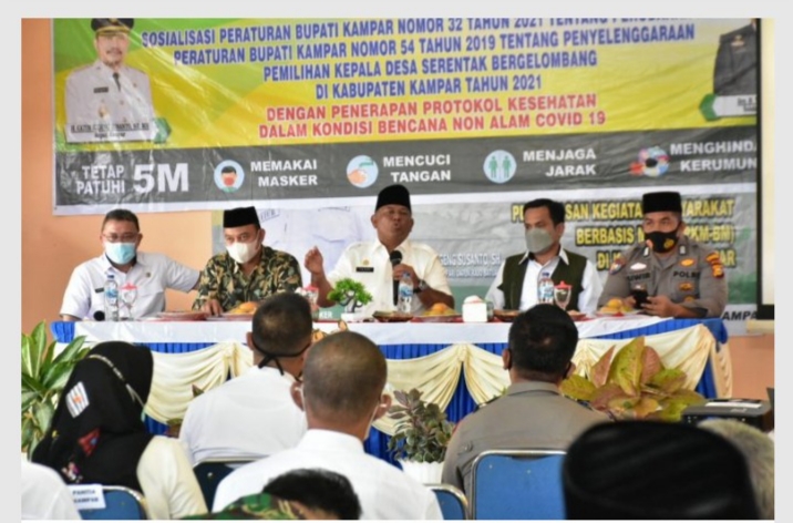 RIAUMADANI. COM - Menjelang pelaksanaan Pemilihan Kepala Desa serentak yang insyaallah hari Hnya akan diadakan pada 17 November 2021, pemerintah Kabupaten Kampar melakukan sosialisasi Perbup nomor 54 tahun 2021btentang Pilkades Serentak bergelombang kepada Kepanitian Pilkades di tingkat Kecamatan dan desa, Kepanitiaan Pilkades. Karena Pilkades ini di gelar pada masa pendemi Covid-19.