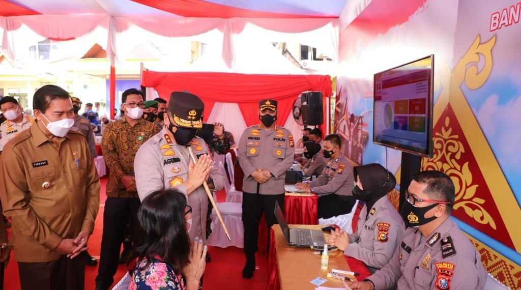RIAUMADANI. COM - Kapolda Riau Irjen Pol. Agung Setya Imam Effendi, SH, SIK, MH, didampingi Walikota Pekanbaru H. Firdaus dan Forkopimda Kota Pekanbaru menyerahkan Bantuan Tunai untuk Pedagang Kaki Lima dan Warung (BTPKLW) di Mako Polresta Pekanbaru, Kamis (07/10/2021).