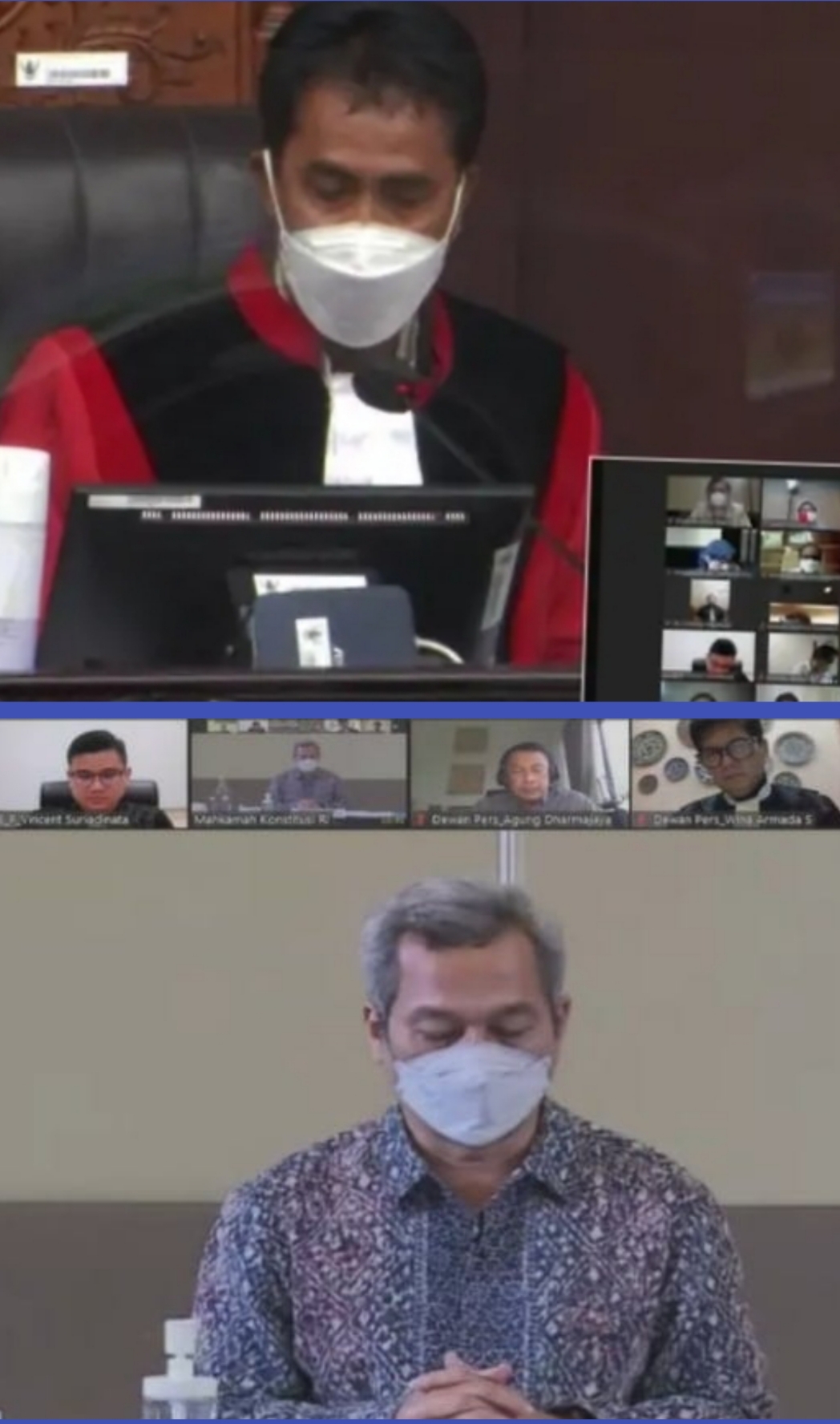 RIAUMADANI. COM – Presiden Republik Indonesia Joko Widodo memberikan keterangan tertulis secara daring pada sidang Uji Materi pasal 15 Ayat (2) huruf f dan ayat (3) Undang-Undang Nomor 40 Tahun 1999 Tentang Pers di Gedung Mahkamah Konstitusi, Senin (11/10/2021) siang. Keterangan tertulis Presiden Joko Widodo disampaikan melalui kuasa hukumnya Menteri Hukum dan Ham RI Yasona Laoli dan Menteri Kominfo Johny Plate yang dibacakan langsung oleh Direktur Jenderal Informasi dan Komunikasi Publik Kementerian Kominfo Usman Kansong.