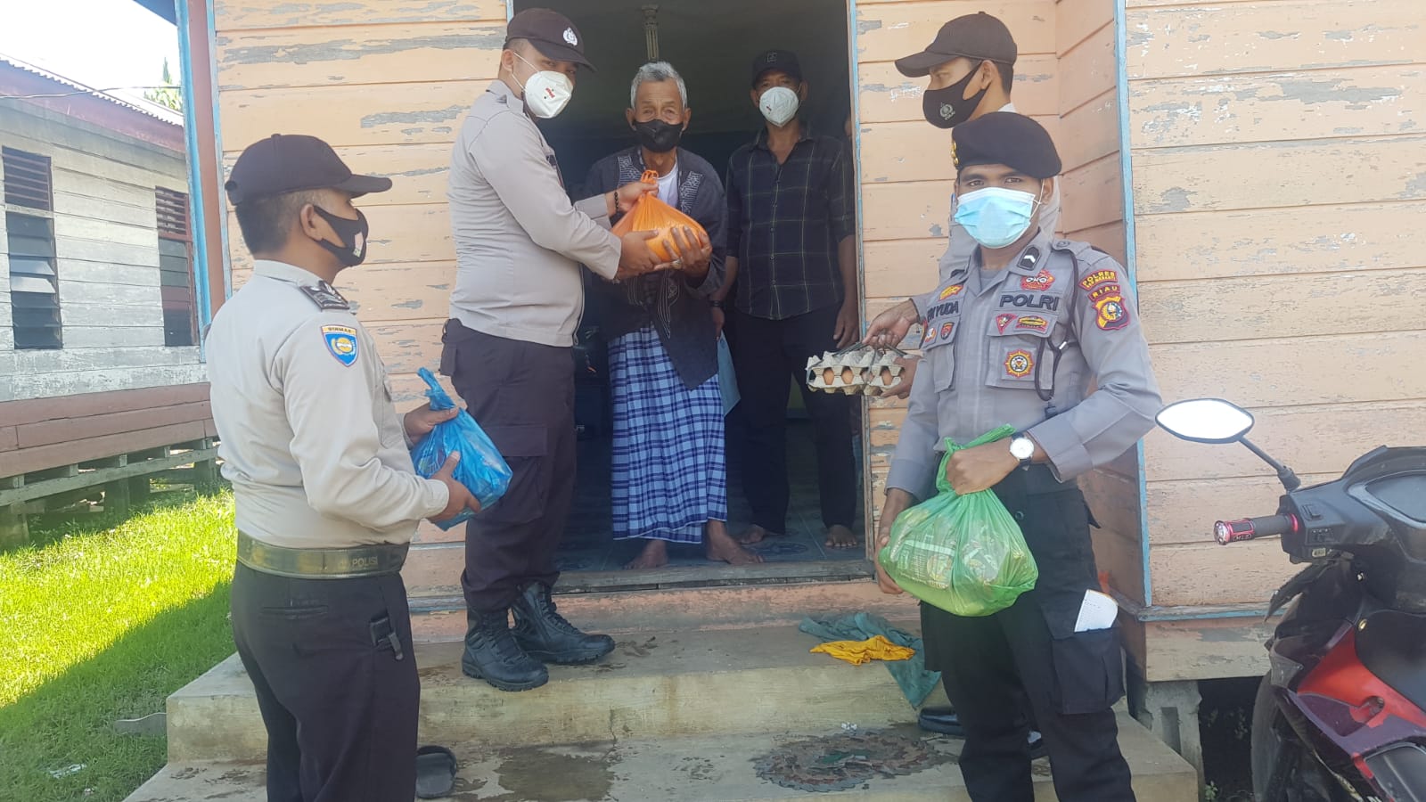 Kapolsek Rangsang Barat, IPTU JA Lubis SH MH, membagikan sembako yang merupakan program Polres Meranti dalam membantu meringankan beban warga kurang mampu di wilayah hukum Polsek Rangsang Barat saat Pandemi Covid-19.