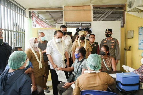 RIAUMADANI. COM - Bupati Bengkalis Kasmarni mendampingi Wakil Menteri Desa Pembangunan Daerah Tertinggal dan Transmigrasi (PDTT) Republik Indonesia Budi Arie Setiadi meninjau vaksinasi di Puskesmas Pinggir, Senin (25/10/2021). Total ada 500 dosis vaksin yang disediakan untuk masyarakat secara gratis.