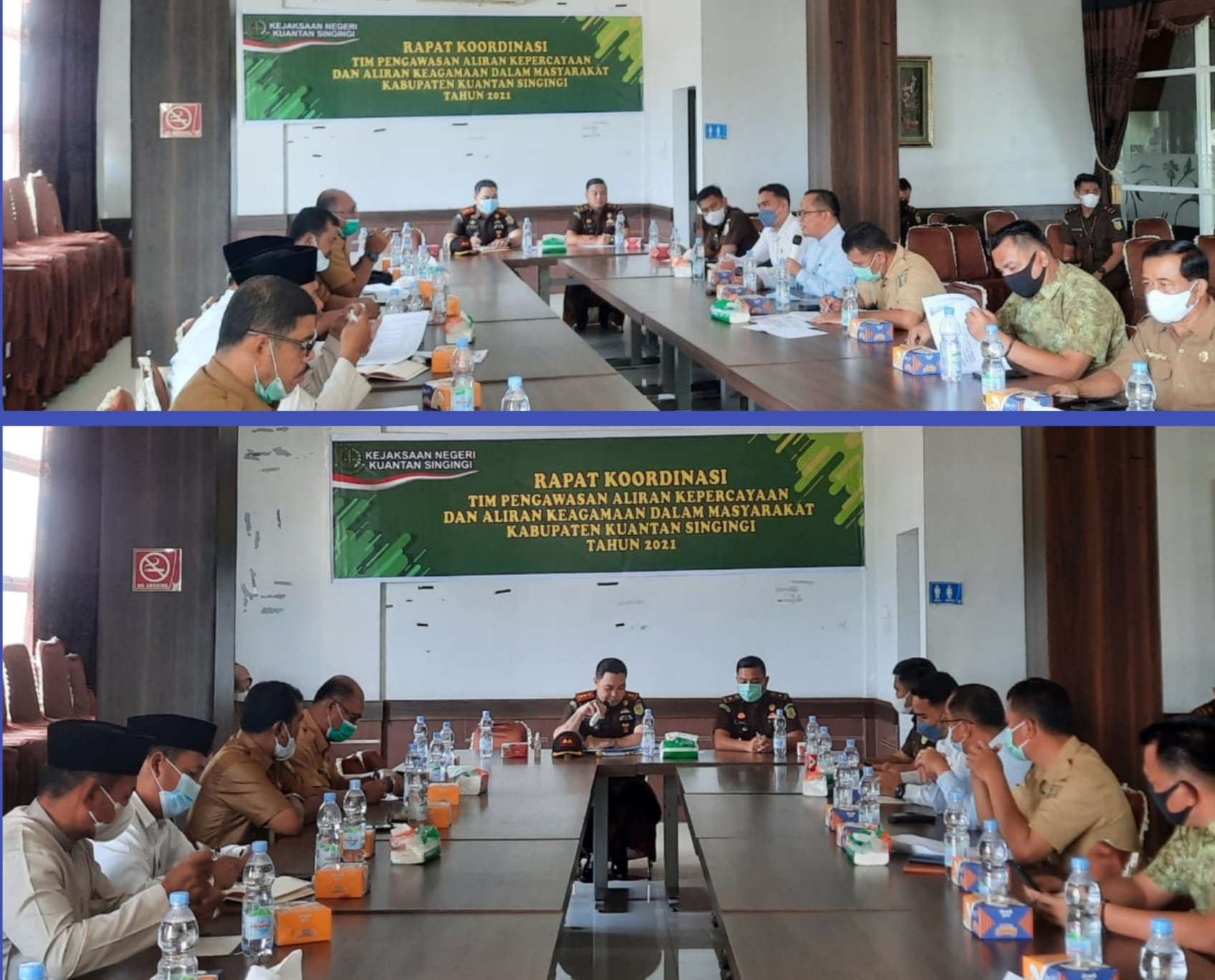 RIAUMADANI. COM - Rapat Koordinasi Tim Pengawasan Aliran Kepercayaan dan Keagamaan dalam Masyarakat (PAKEM) dipimpin langsung oleh Kepala Kejaksaan Negeri (Kajari) Kabupaten Kuantan Singingi (Kuansing), Hadiman SH MH didampingi Kasi Intel Kejari, Rinaldy Adriansyah SH MH di Aula Rapat Restaurant Sederhana Teluk Kuantan, Senin (29/11/2021).