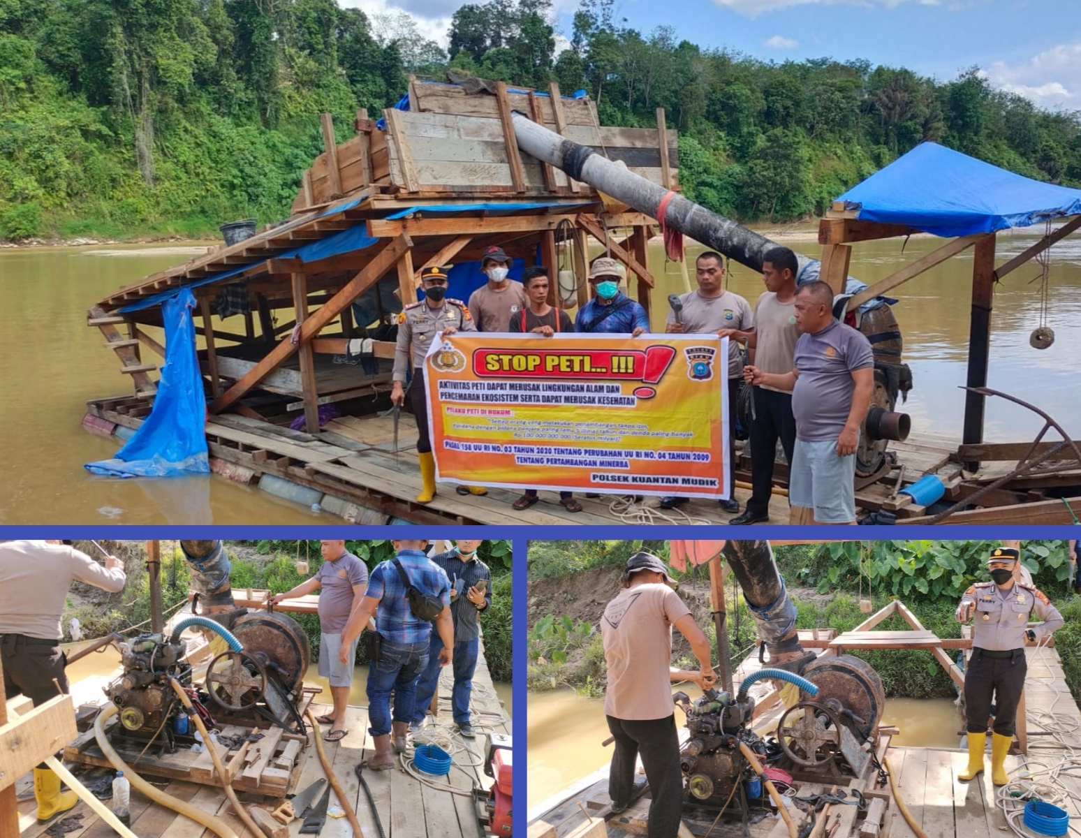 " Kita dapat laporan dari masyarakat adanya aktivitas Penambangan Emas Tanpa Izin ( PETI ) Jenis Kapal Ponton di Aliran Sungai Kuantan Desa Rantau Sialang dan Desa Luai. Dari informasi tersebut kami lansung melakukan penyisiran, hasilnya kami menemukan lima unit rakit yang sedang terparkir. Kami langsung melakukan pengrusakan mesin dan peralatan lainnya," ujar Iptu Ferry.